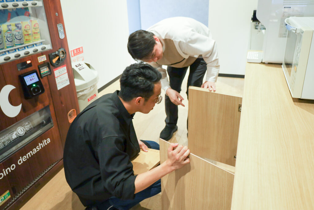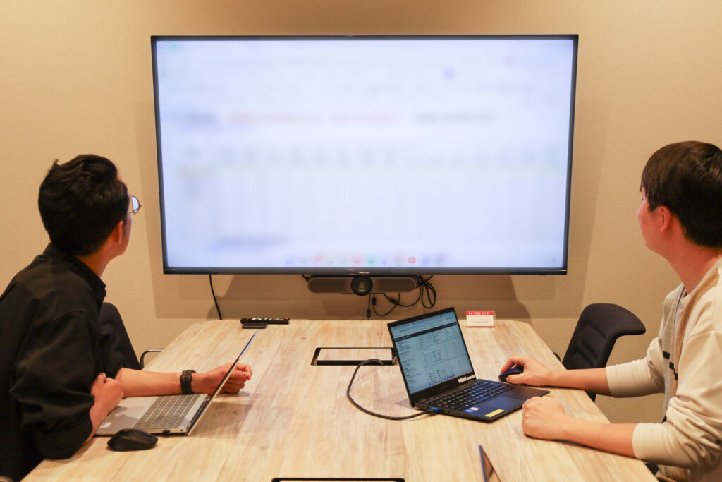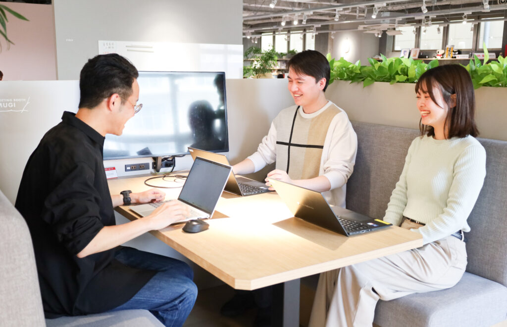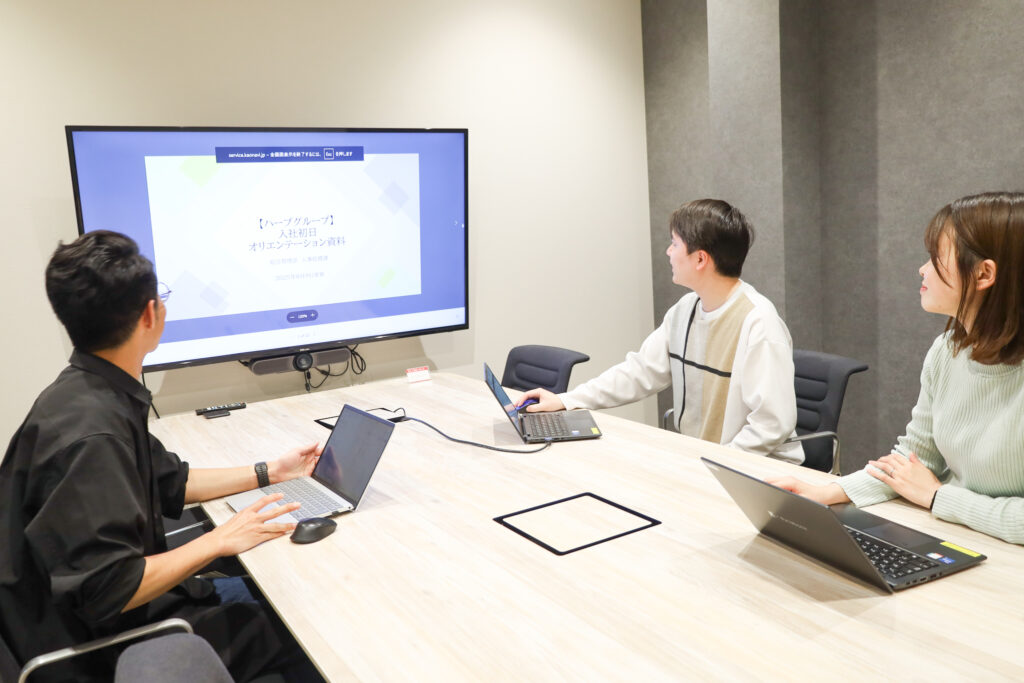 入社初日はオリエンテーションとして、会社の概要や出勤〜退勤までのおおまかな1日の流れ、社内備品・設備に関する説明を受けます。人事・総務のふたりが丁寧に案内してくれました。