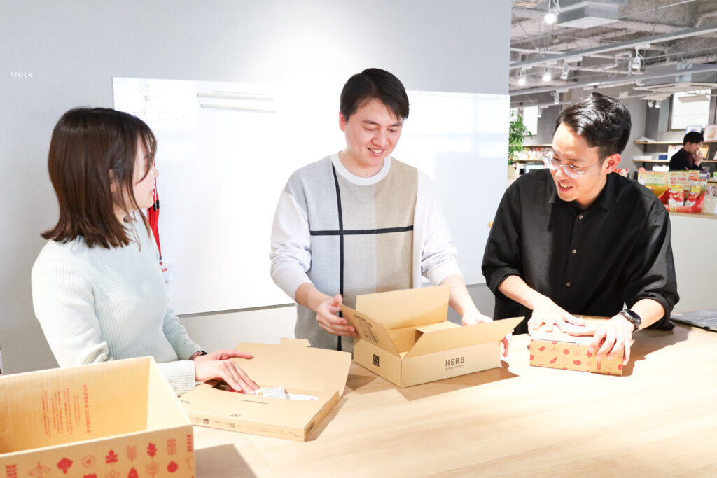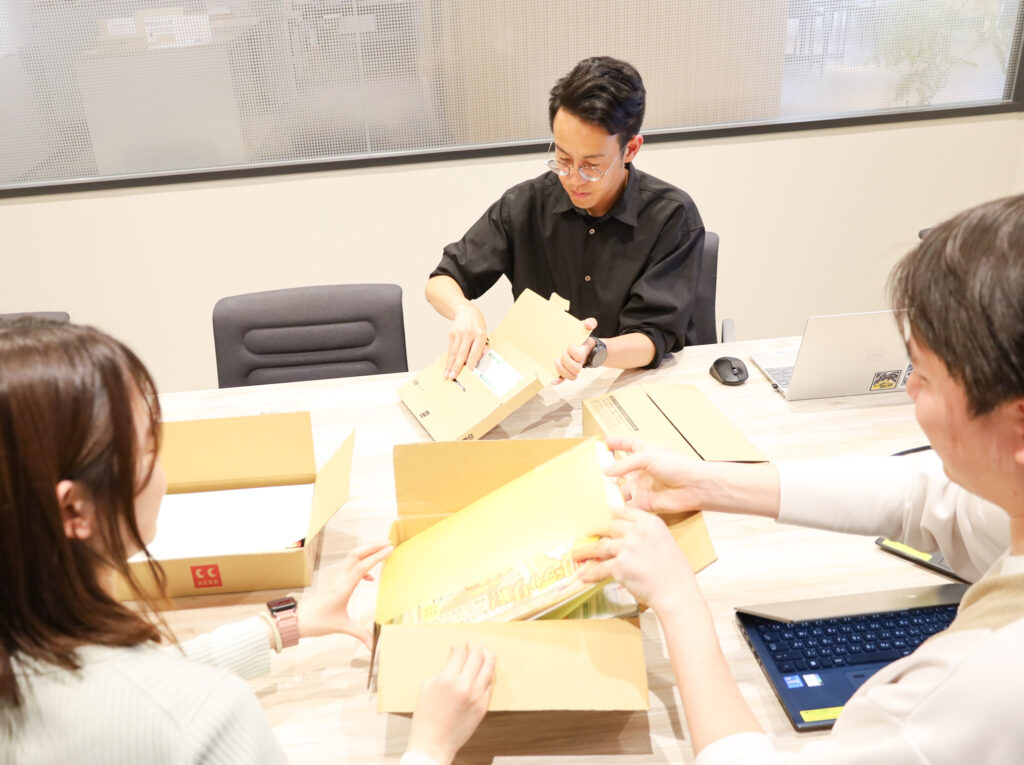 通販概要レクチャーの一環で、資料での説明と併せてお客さまのお手元に届く同梱物・配送箱を確認する時間があります。資材がどの部門で生産・管理されているのか、どういう流れで梱包・出荷されるのか、同梱物の企画はどの部署が考え、どのように具現化されるのか。実際のクリエイティブを確認しながら説明を受けるので、よりクリアにイメージできました。